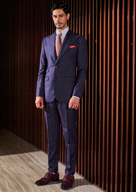 Tailored to perfection by Vercelli, the suit boasts a modern silhouette and premium fabric, providing both comfort and style throughout the day. The shining blue base offers versatility, while the maroon check infuses the ensemble with a touch of sophistication and individuality.